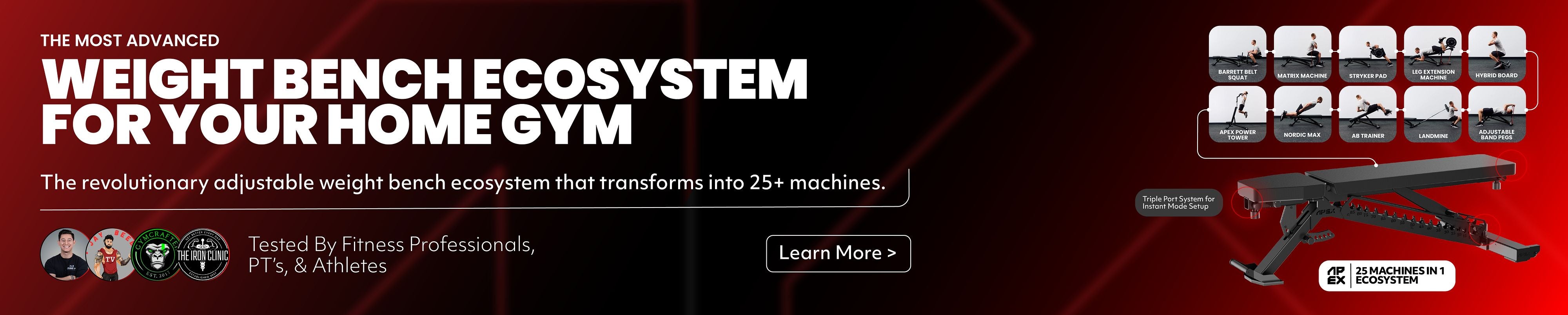 The APEX Ecosystem is a fully integrated training system built around the APEX Adjustable Bench. Every attachment is engineered to connect directly to the bench, transforming it into multiple machines in one. Instead of buying separate bulky equipment, you expand your setup piece by piece with attachments like the Nordic MAX, Stryker Pad, Landmine, Ab Trainer, Leg Extension, Belt Squat, Power Tower, and more.