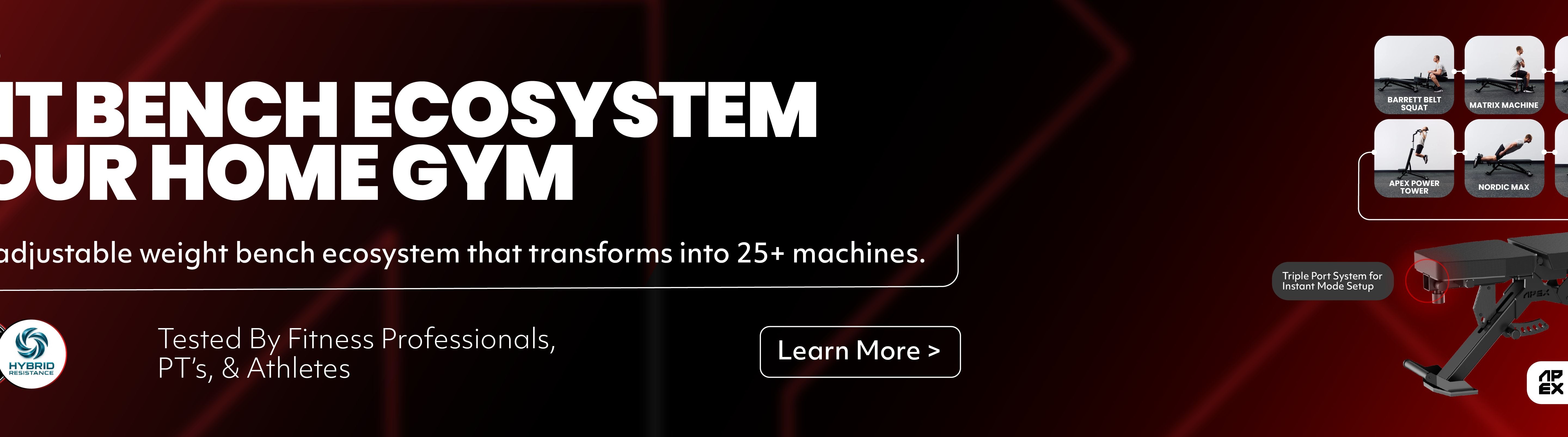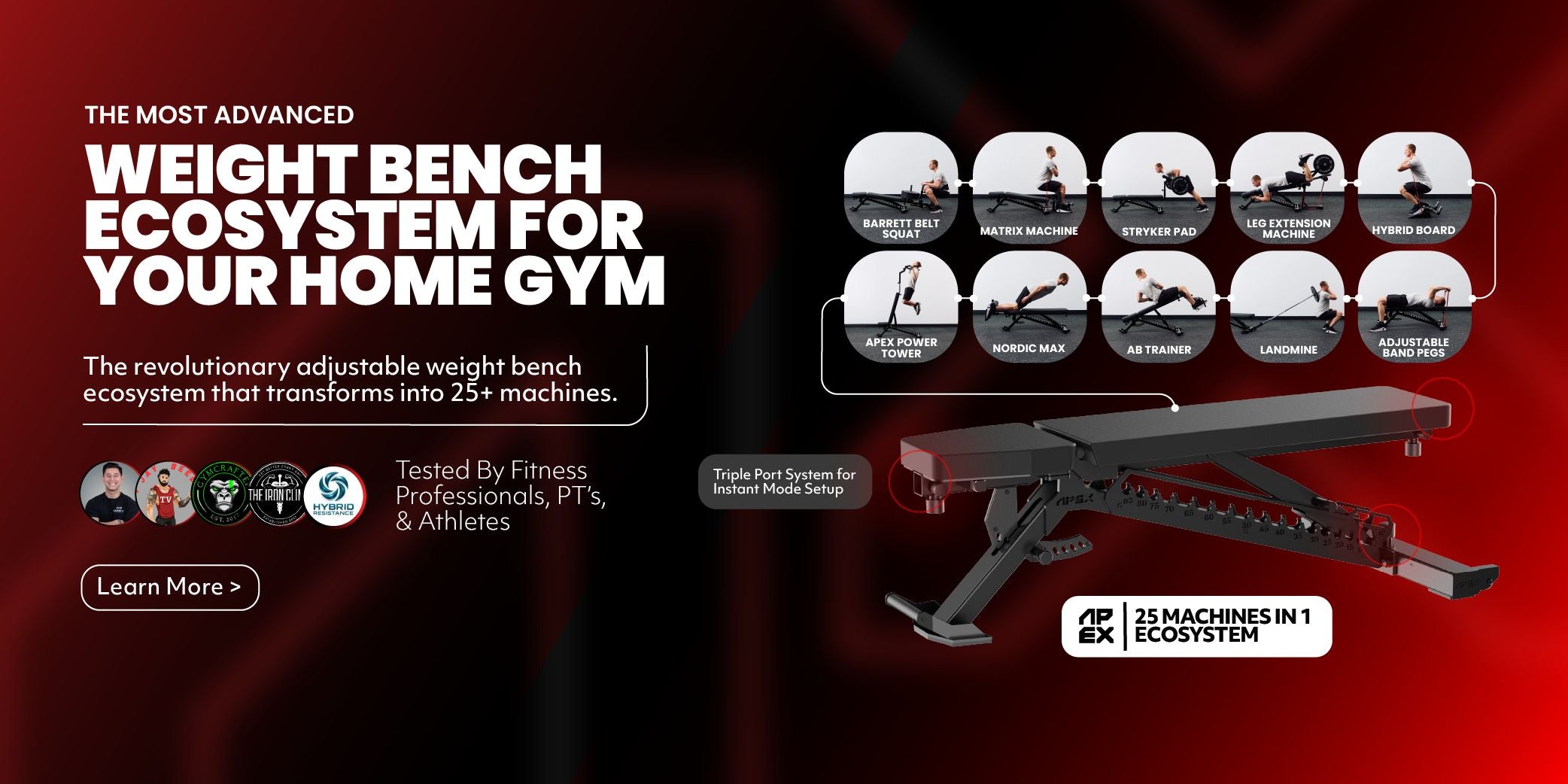 The APEX Ecosystem is a fully integrated training system built around the APEX Adjustable Bench. Every attachment is engineered to connect directly to the bench, transforming it into multiple machines in one. Instead of buying separate bulky equipment, you expand your setup piece by piece with attachments like the Nordic MAX, Stryker Pad, Landmine, Ab Trainer, Leg Extension, Belt Squat, Power Tower, and more.