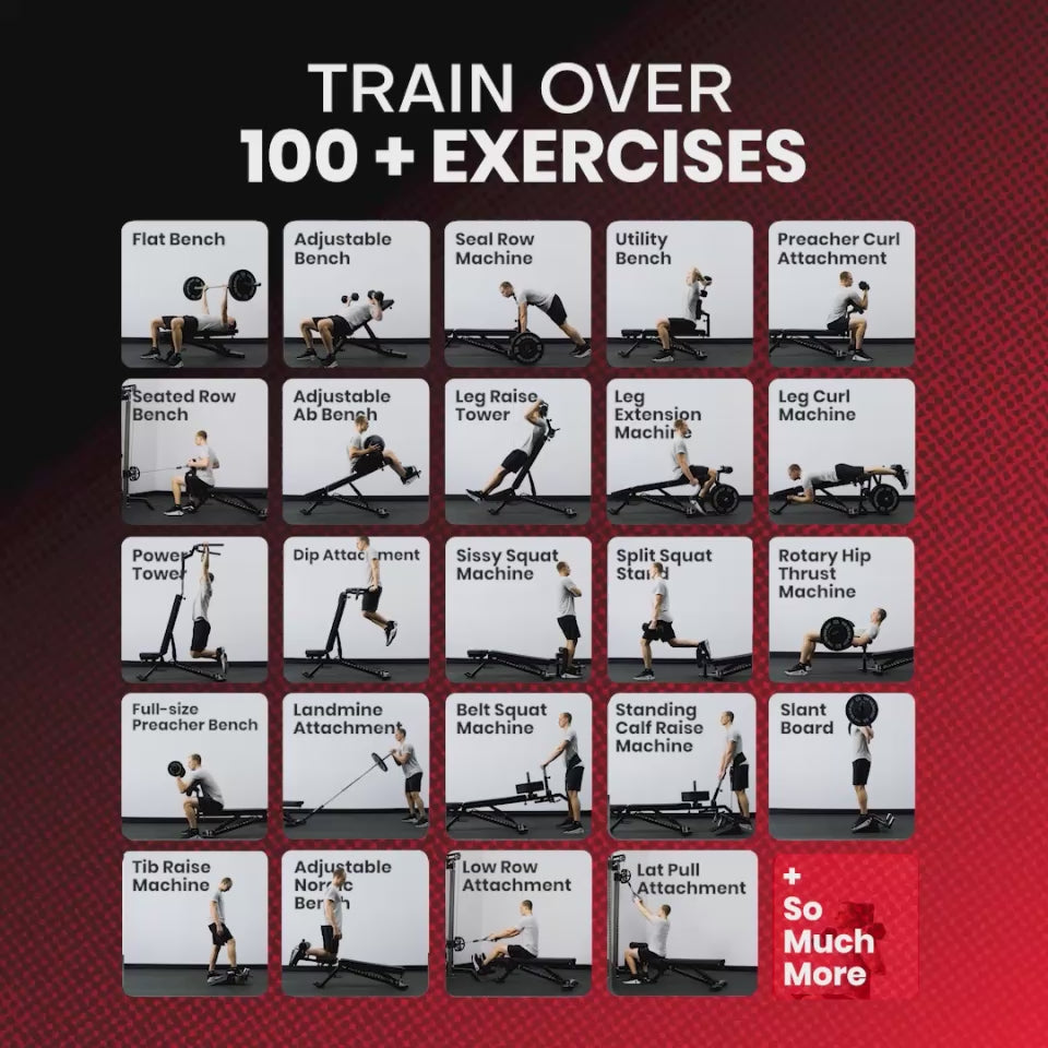 combines Sissy Squats, Hip Thrusts, Split Squats, and Preacher Curls in one compact unit.