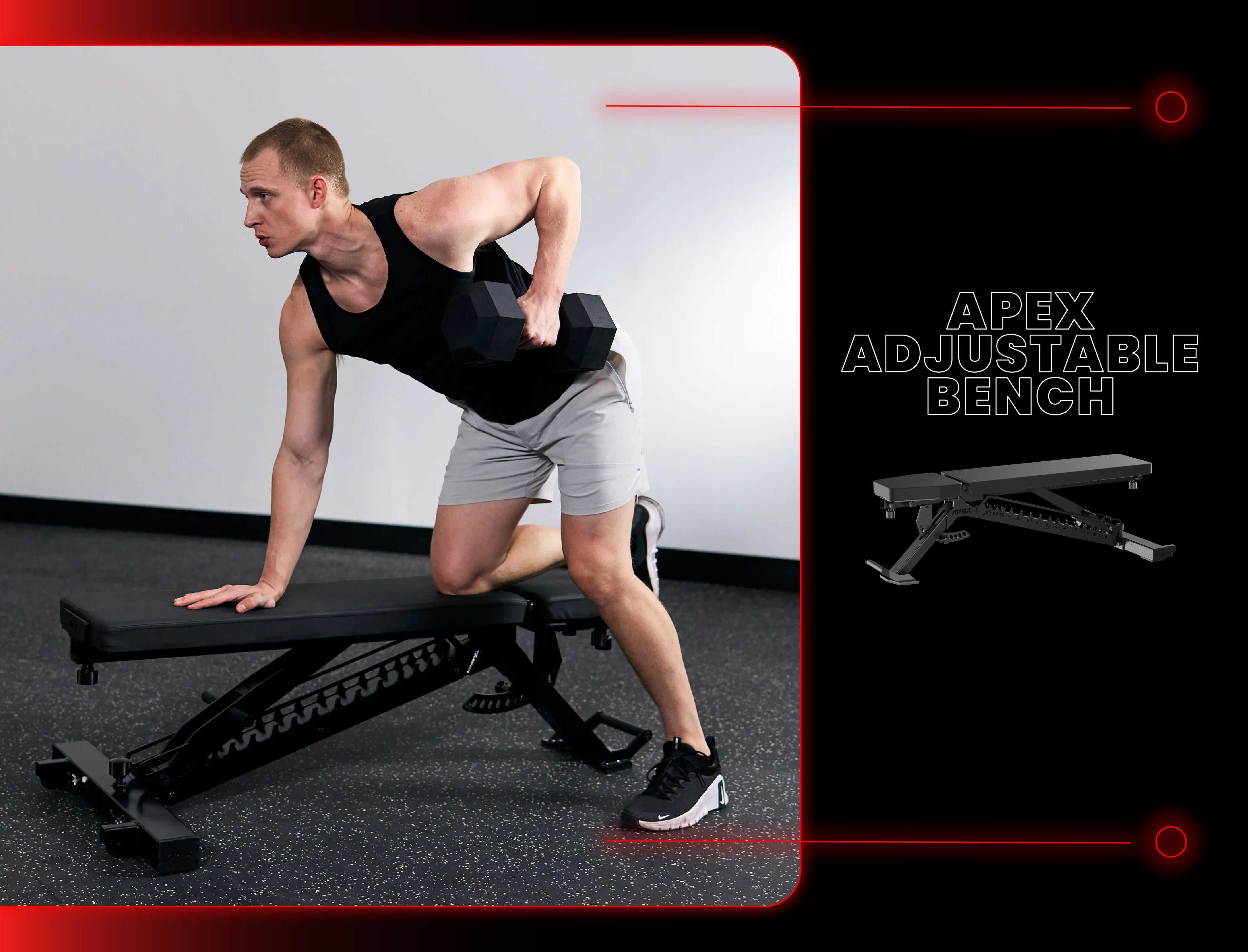 The APEX Adjustable Bench is designed for anyone who wants a durable, high-performance bench for strength training. It’s ideal for home gym owners, athletes, and lifters of all levels who want the ability to perform flat, incline, and decline work while unlocking additional training options through the APEX Ecosystem attachments.