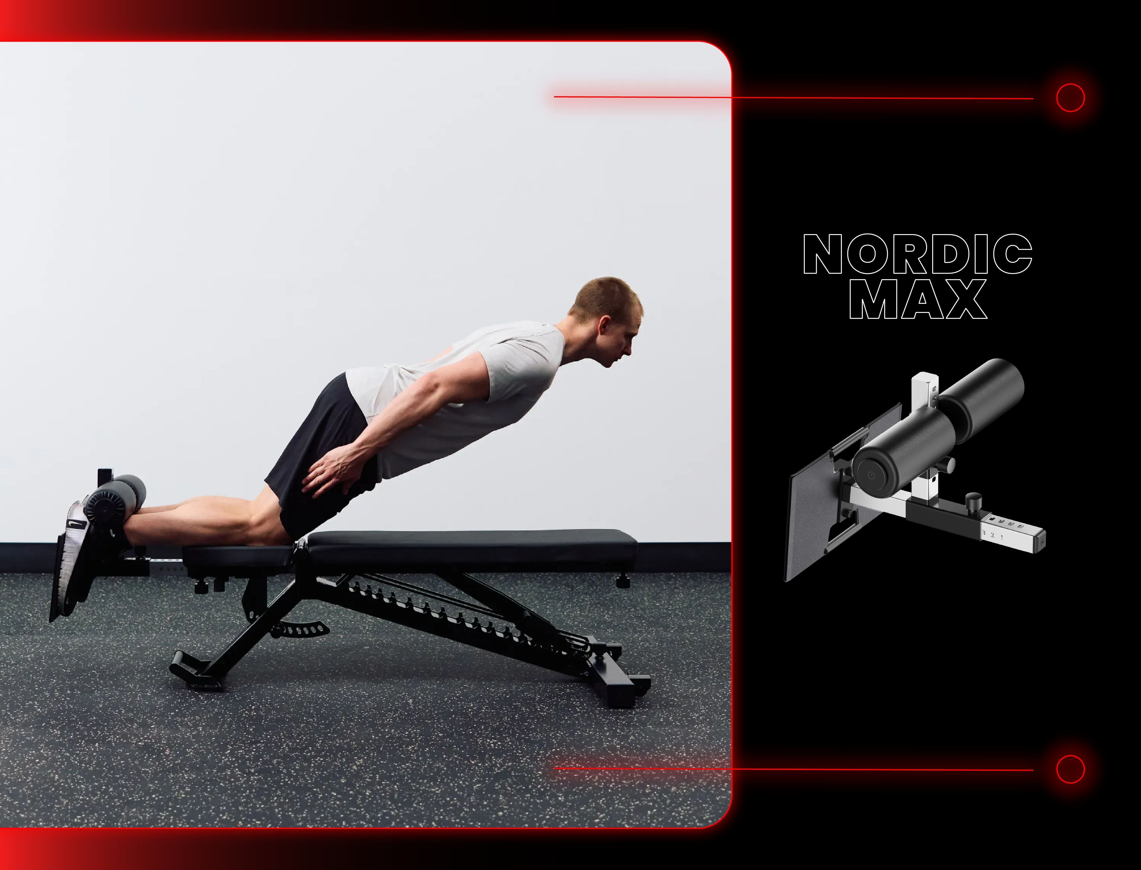 The APEX Nordic Max is a 4-in-1 attachment that expands the APEX Adjustable Bench into a complete lower-body and back training station. It combines an adjustable Nordic bench, a seated row platform, a lat pulldown seat, and a split squat setup in one compact, versatile unit.