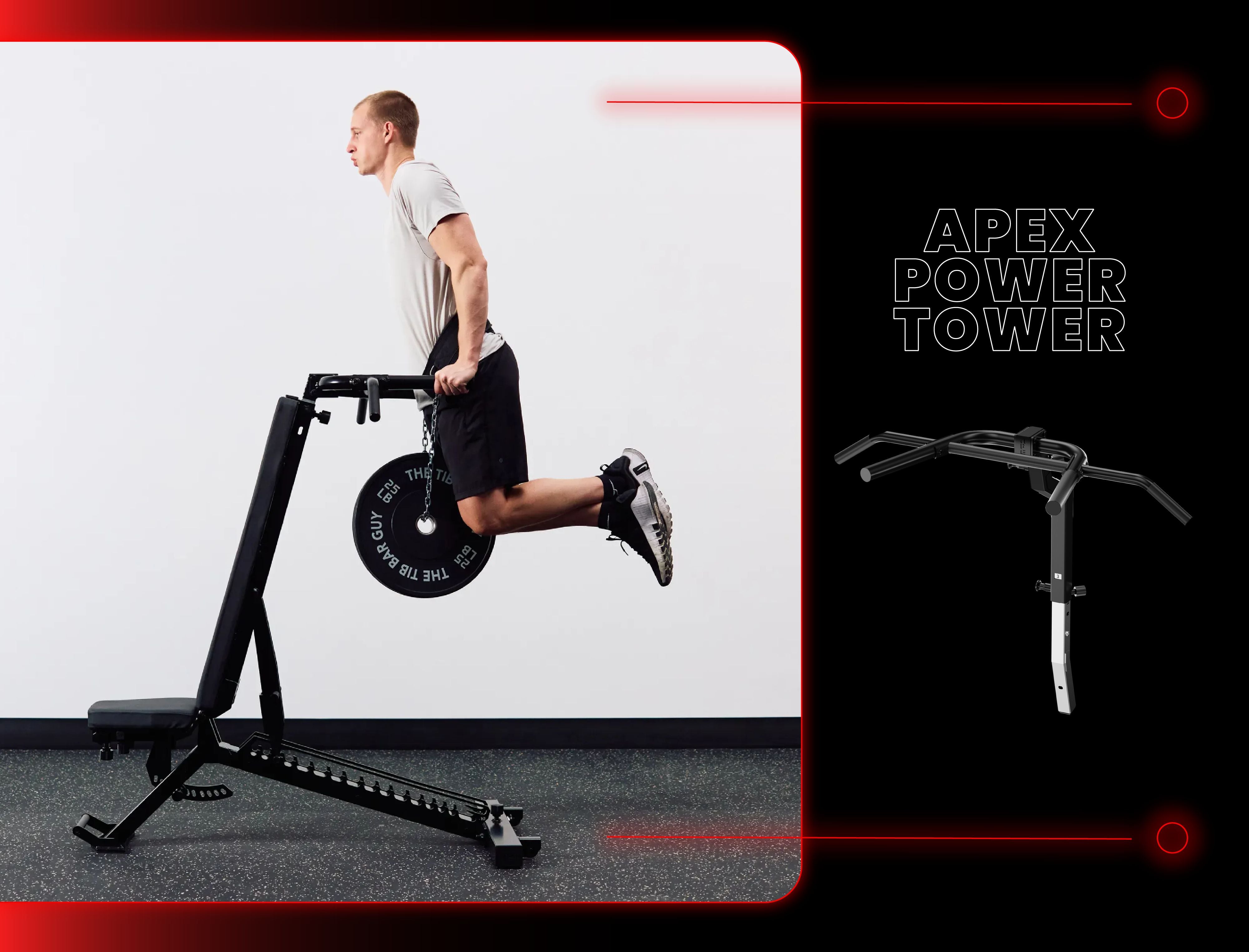 The APEX Power Tower transforms the APEX Adjustable Bench into a compact upper-body and core station. It features knurled handles for pull-ups, chin-ups, and dips, along with supportive back pads for stable, controlled leg raises.