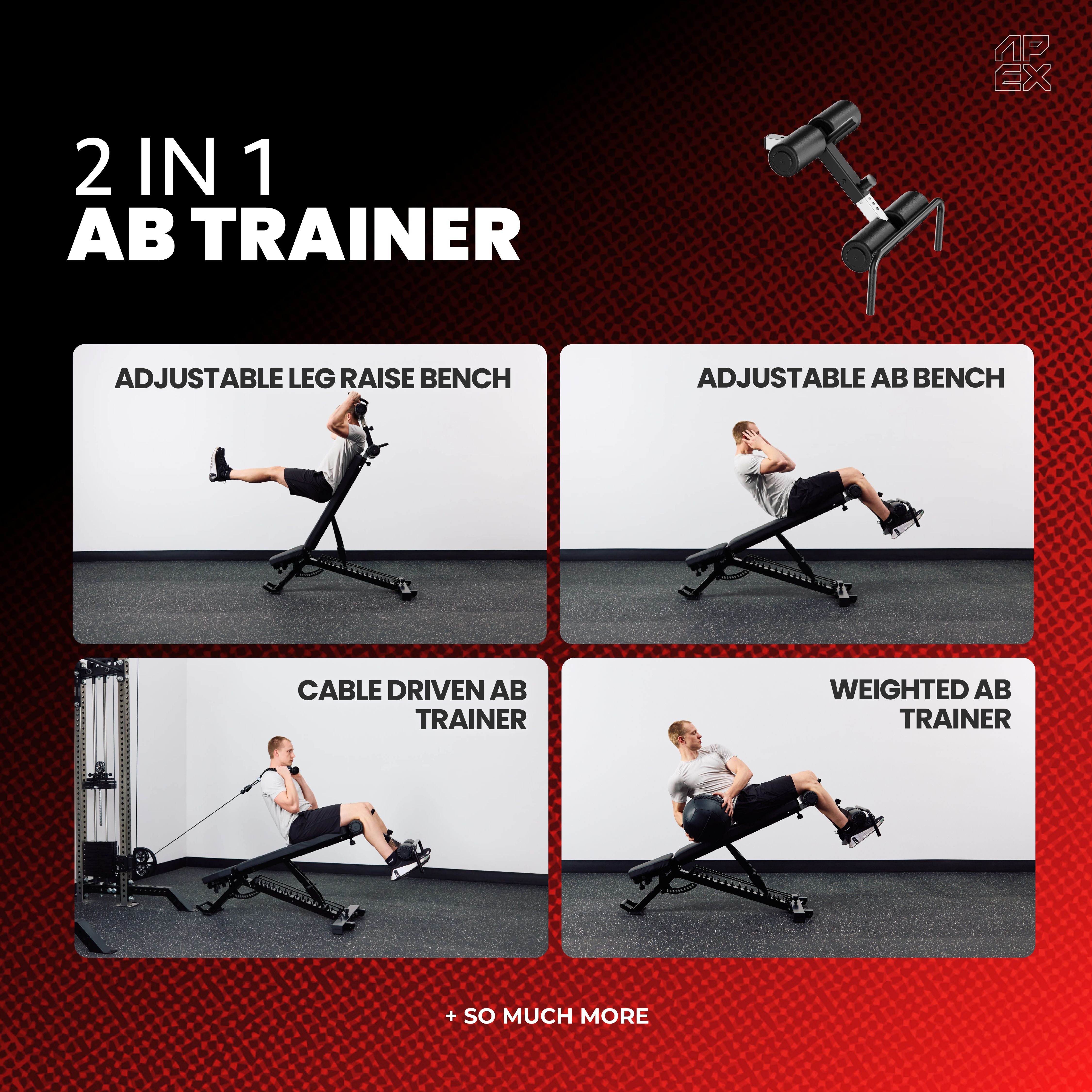 connects to the APEX Adjustable Bench, turning it into an adjustable decline station for ab training with integrated handles that allow leg raises for added versatility.