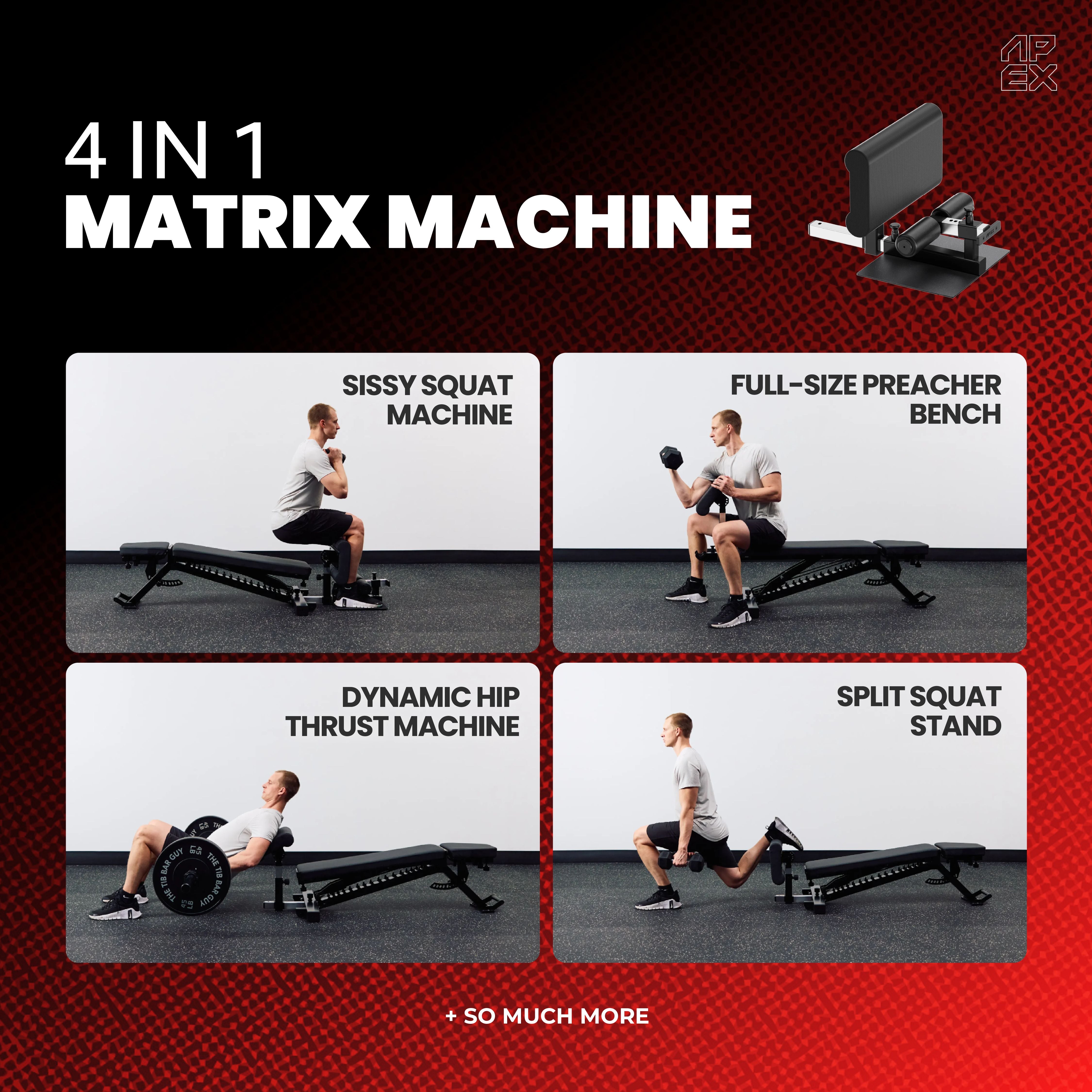 combines Sissy Squats, Hip Thrusts, Split Squats, and Preacher Curls in one compact unit.