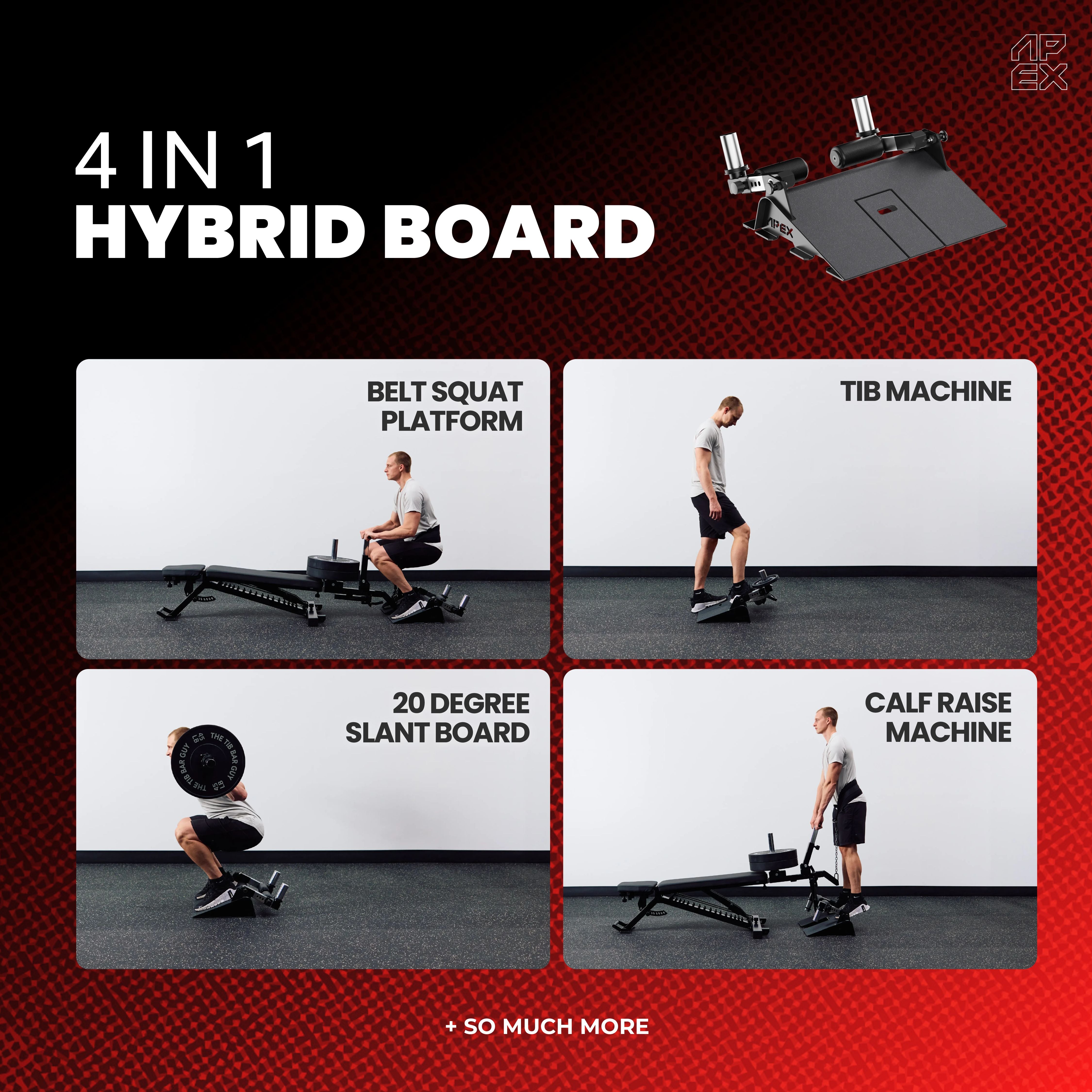 is the first platform to combine a Slant Board, Tib Machine, Calf Raise Block, and Belt Squat Platform in one compact, multi-functional unit for complete lower-body training.