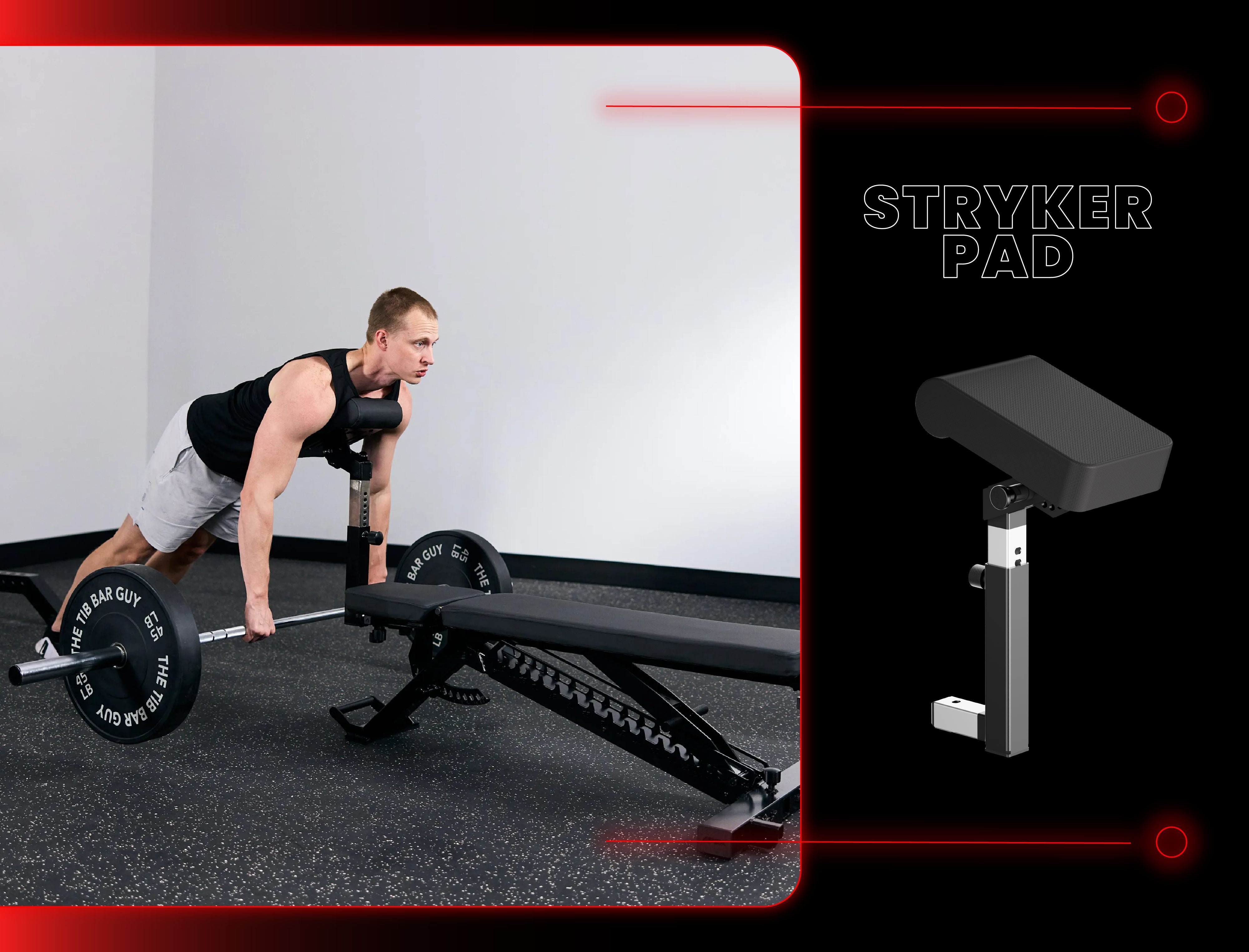 The Stryker Pad supports a wide range of upper-body exercises, including chest-supported rows, seal rows, shoulder presses, Arnold presses, tricep extensions, single-arm preacher curls, and much more. Its adjustable pad angle and height make it easy to dial in positioning for proper mechanics and comfort during each movement.