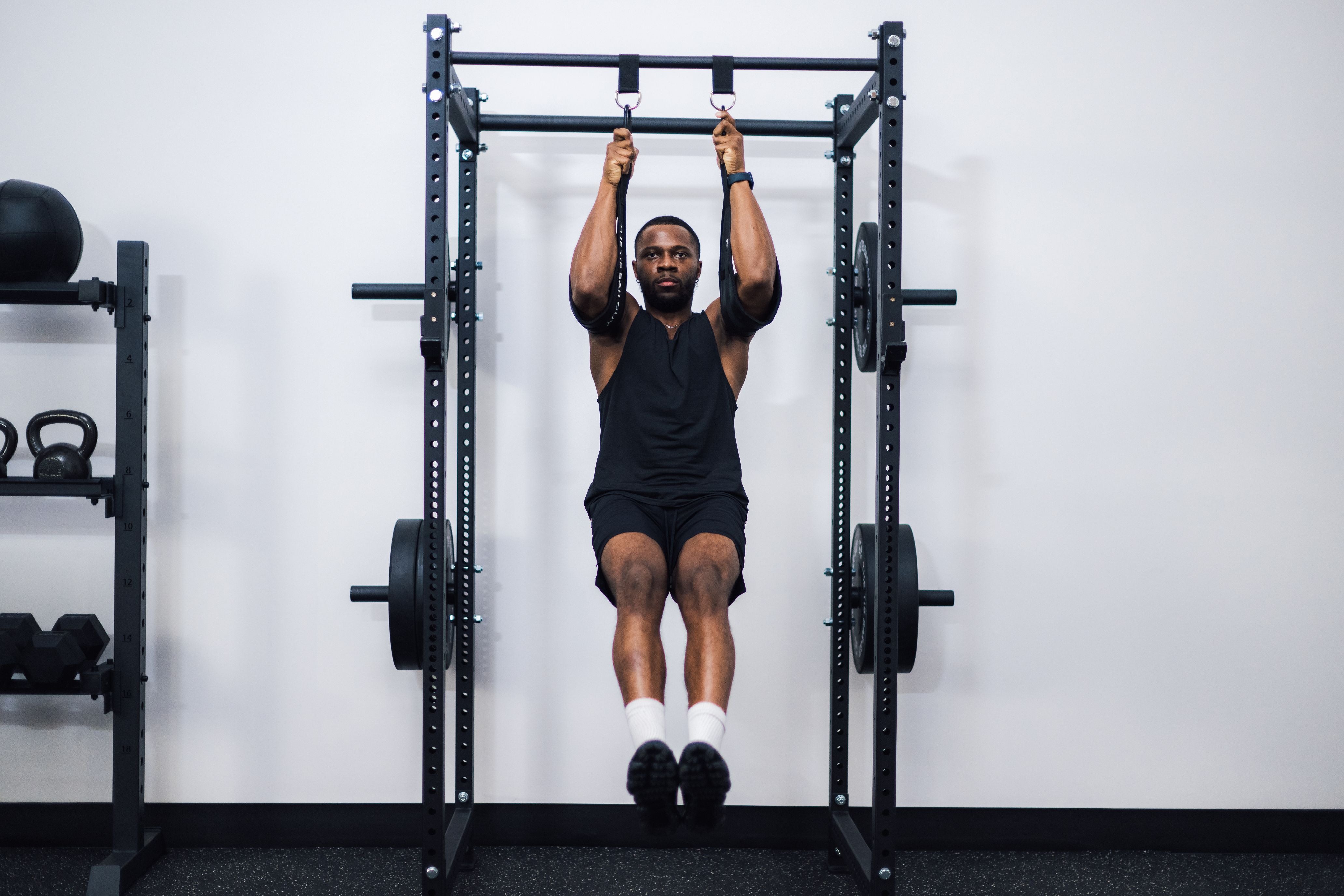 Setting up is quick and easy. Simply clip the included steel carabiners onto any pull-up bar, squat rack, or overhead bar. Make sure the straps hang evenly, then slide your arms through the loops so the padding rests comfortably on your upper arms.