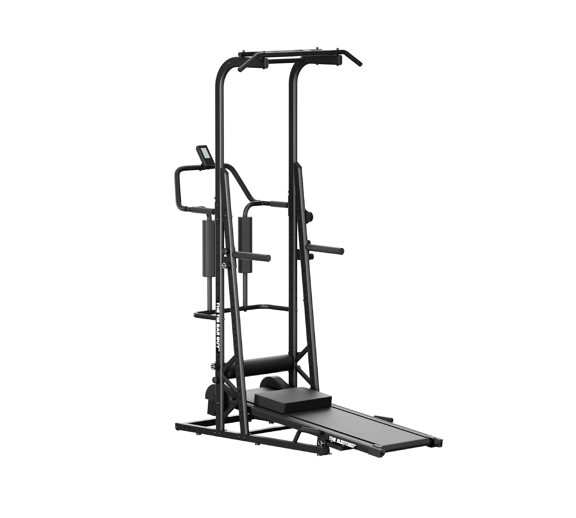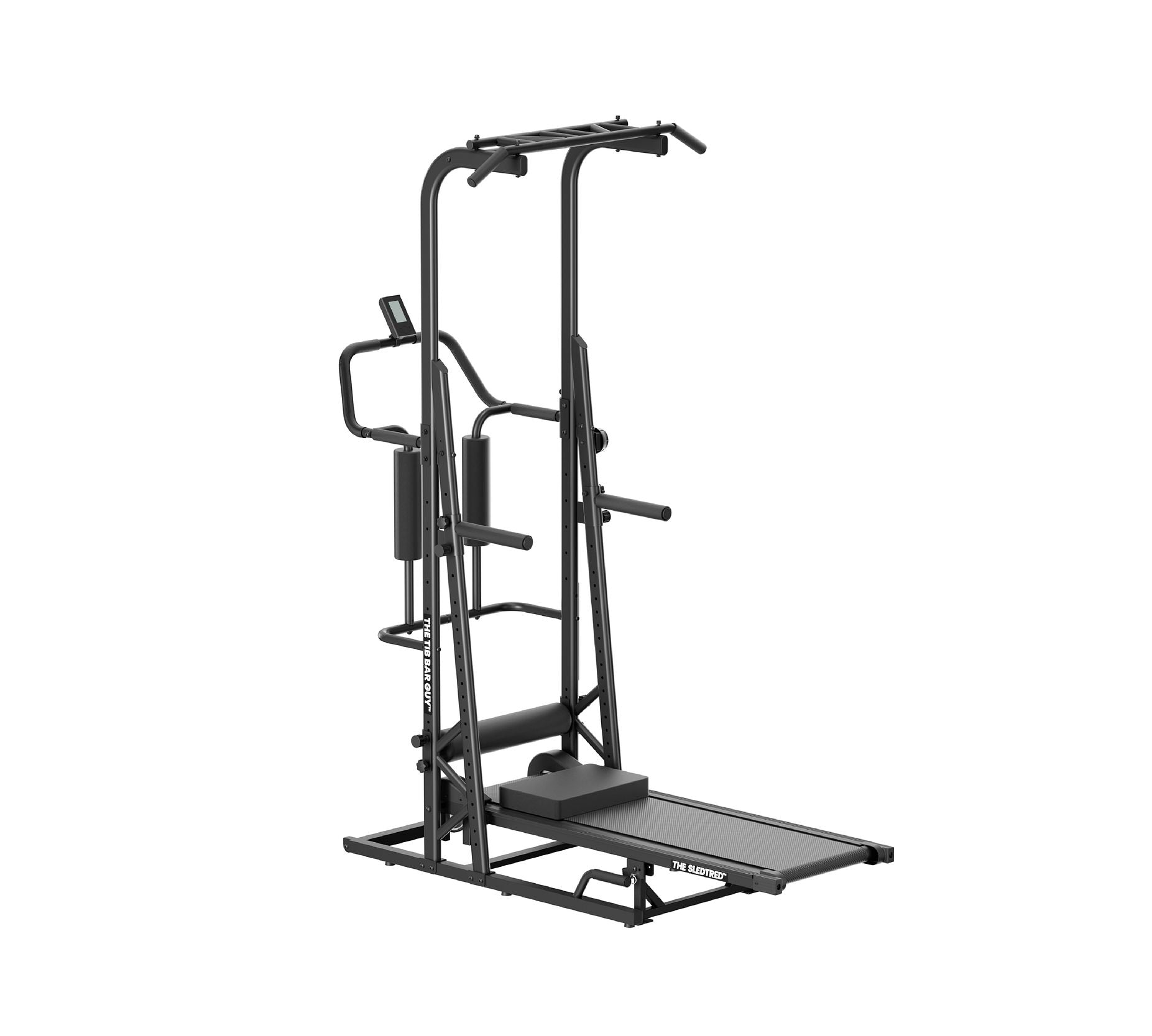 The SledTred is a 6-in-1 fitness machine that combines a manual treadmill, resistance sled, pull-up and dip station, hip thrust station, Nordic bench, and sit-up bench an all in one compact unit.